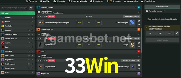 O 33Win oferece uma grande seleção de opções de apostas em e-sports com probabilidades competitivas